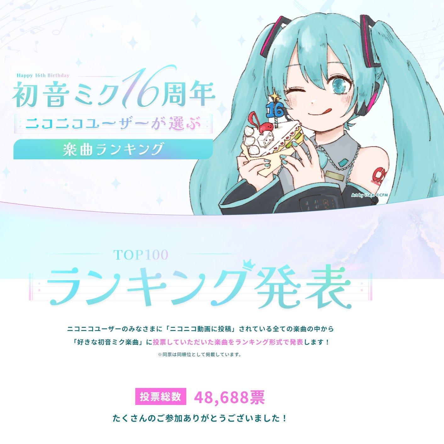 介绍: 根据n站投票选出的 “初音未来16周年歌曲排行榜” 前100名整理而成的歌单。祝初音未来16周年快乐!