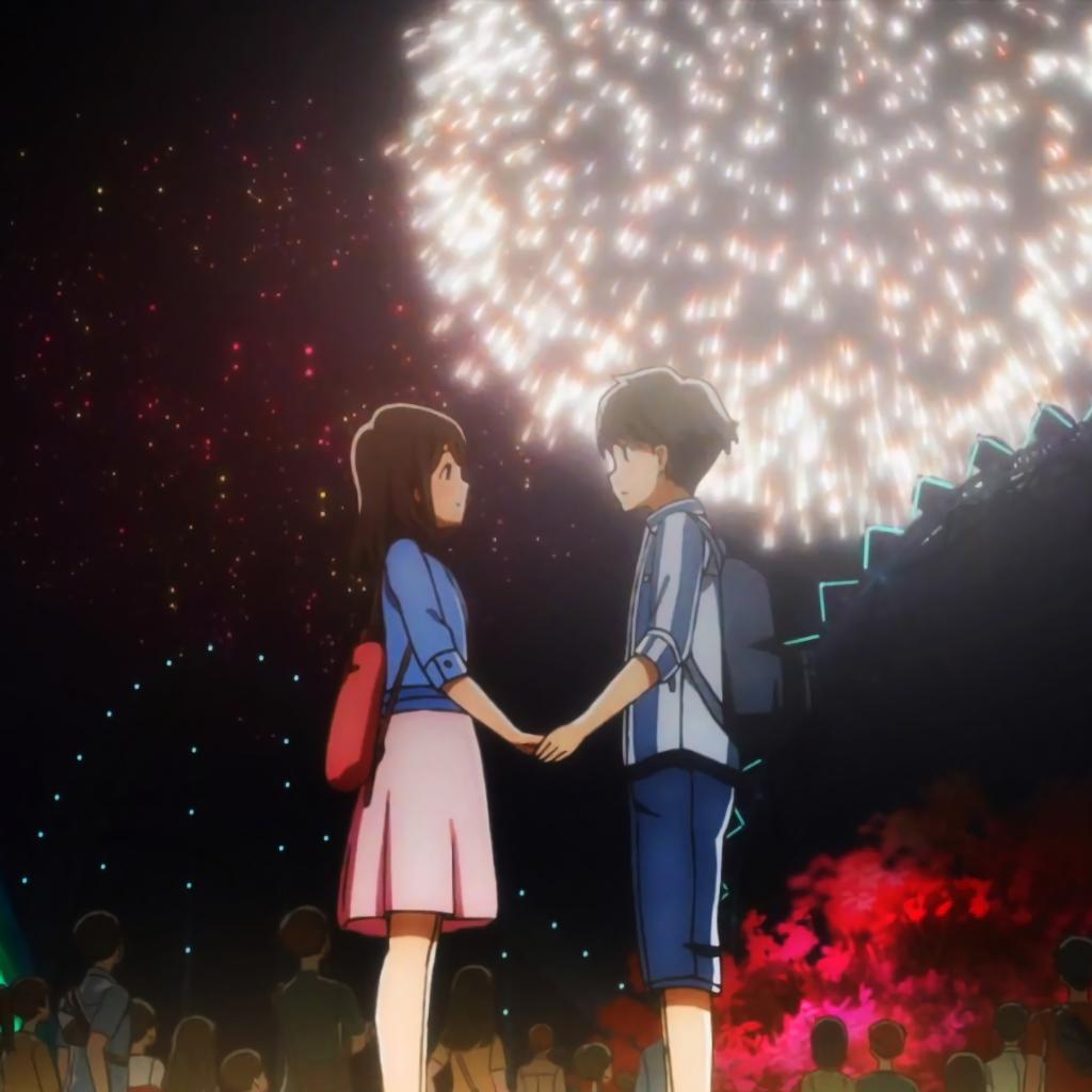 1.本来我想找一张同时包含了《月色真美》男女主,而且背景是月亮的图片做封面。但没有找到符合这个条件下满意的图片,最终使用了动画第7集,安昙和水野在看烟花时的一张截图。