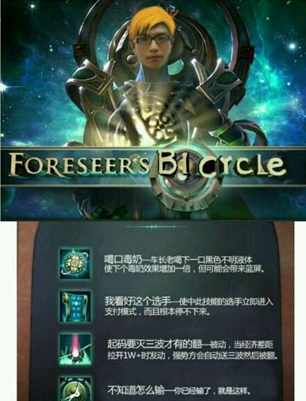 案例四:总是有些人不盼别人的好,老是帮别人乱立flag,这种恶劣的行为,我们称其为“毒奶”。而将这一神功练到出神入化的,就是dota2的知名解说——单车老湿。单车老湿的毒奶神功,可谓奶谁谁死,弹无虚发,知道自己被单车看好的选手们,都瑟瑟发抖,纷纷跪地求饶。