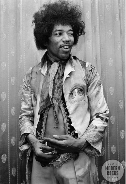 1967年伦敦Saville剧院的后台上,当时还没封神的Jimi Hendrix正穿着滚石乐队主唱Mick Jagger的弟弟Chris Jagger手绘图案的夹克衫,对着Byrne镜头微笑。刚刚在英国出名的美国吉他手兼歌手还无法预知在不久的将来他将以自己以绝佳技艺把摇滚乐推上怎样的新高度。