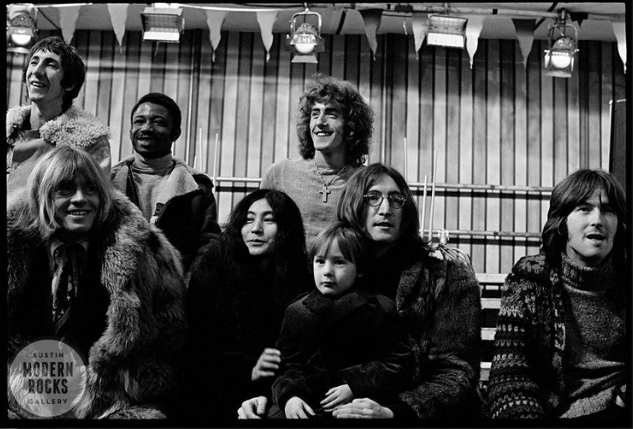 摇滚马戏团是滚石乐队Mick Jagger的鬼主意,1968年冬天他策划了一场为期两天的全明星电视秀,邀请了当时一众明星参与其中,包括滚石乐队几名成员,John Lennon夫妻,Eric Clapton,The Who乐队,Marianne Faithful以及Mitch Micthell等人。可惜这场电视秀最终变成了一场闹剧,尽管大牌云集,可音乐听来却烂得一塌糊涂。Alec Byrne也是这场大秀的见证者之一,他拍摄下这张尤为珍贵的照片,数个摇滚传奇或站或坐地出现在黑白影像中,历史再难重来。他们依次是:Pete Townshend(The Who乐队吉他手), Brian Jones(滚石乐队吉他手,死于1969年), Rock Dijon(英籍加纳鼓手), Yoko Ono(Lennon第二任日籍妻子), Roger Daltrey(The Who乐队主唱), Julian Lennon(Lennon与第一任妻子Cythia所生的长子), John Lennon和Eric Clapton。