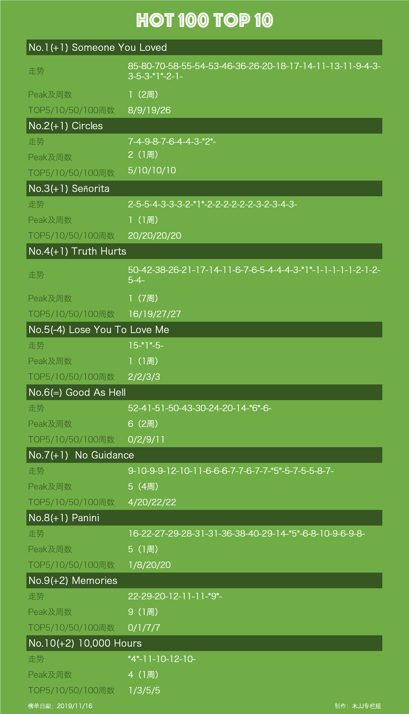 另外的两首"动了"的歌,是《Follow God》和《bad guy》,由于它们一起跌出了前十,所以本周前十又会迎来了两首歌曲。一首是上周刚刚掉出前十的《10,000 Hours》,而另一首便是前十的新朋友《Memories》。