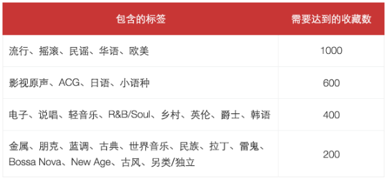 条件2:某一标签下至少有5个完整歌单,每个歌单都符合推荐要求,且每个歌单的收藏量满足相应要求,则可申请该标签的歌单达人(根据标签的不同,达标收藏数不同),具体要求如下:
