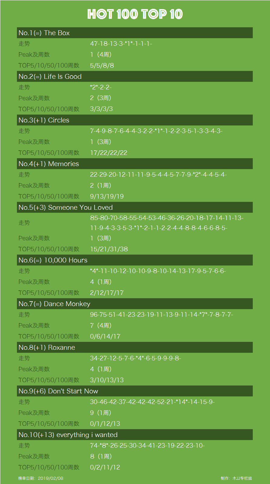 "活好"《Life Is Good》本周继续卡二。空降第二并连续三周卡二,走成了《Rockstar》走势,但鉴于盒皇的强势状态,按目前的成绩差距下周夺冠可能性并不大。