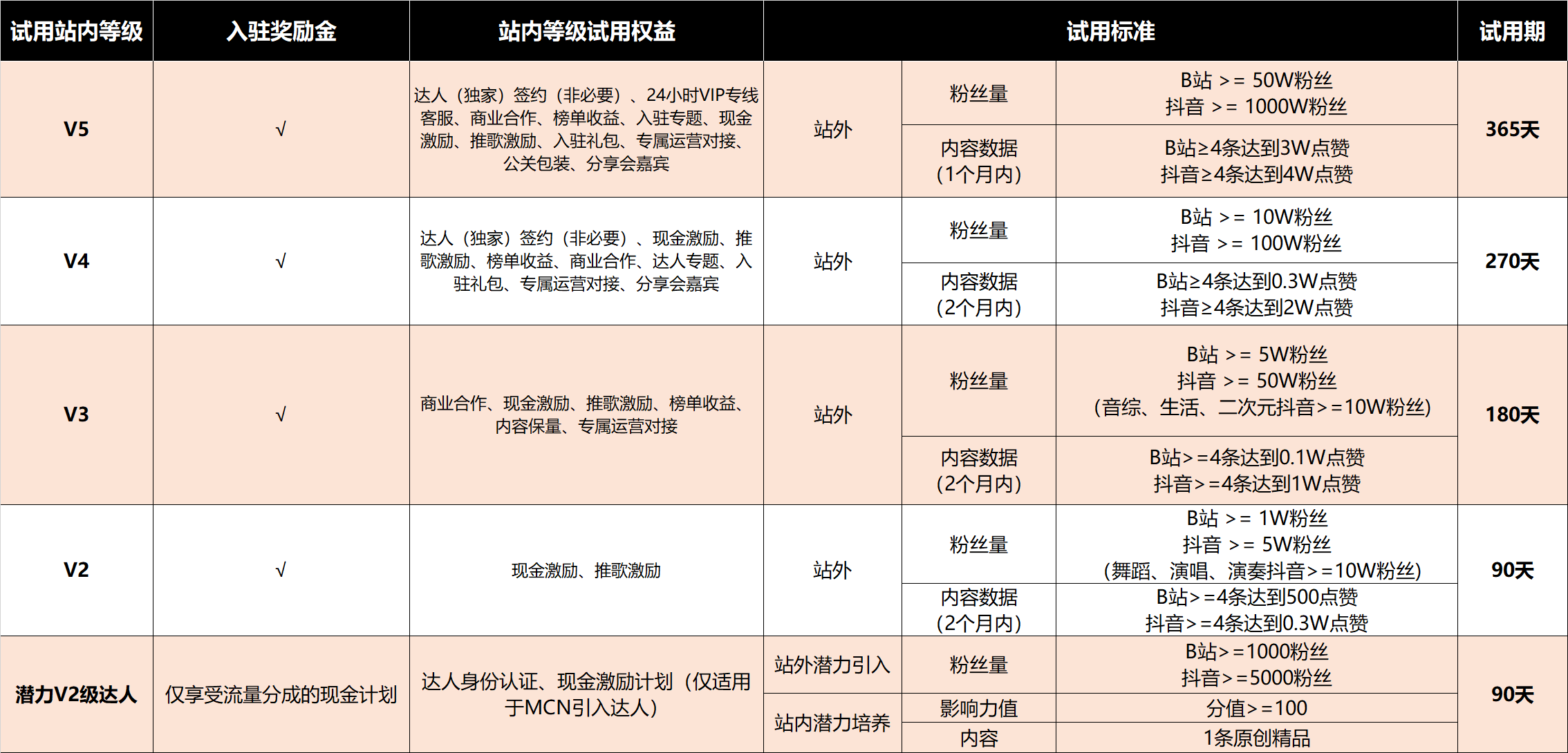 根据子账号在站外单一平台的粉丝量、近期内容点赞数据表现进行评级,共划分为5个等级:V2-V5等级、潜力V2等级且不同等级账号有不同时长的试用周期,合作试用期结束后,根据账号在网易云音乐站内数据重新评估等级,按实际达成等级发放后续权益。